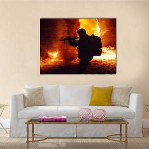 Silhouette of a soldier stands amid intense flames and smoke, with an explosion suggested in the scene. The black, orange and yellow palette and dramatic, action-shot style create a tense, dangerous atmosphere. Fits well in modern or military-themed rooms.