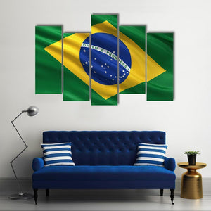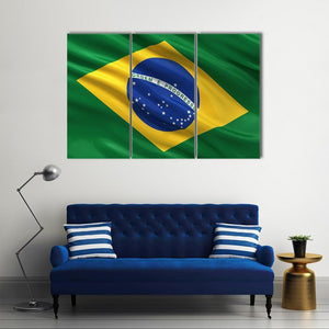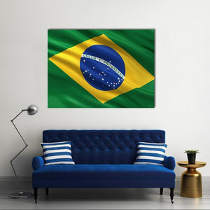 This canvas shows the Brazilian national flag in a realistic, diagonal composition that suggests motion and a patriotic mood. The green, yellow, blue and white palette centers on the blue circle with the motto “ORDEM E PROGRESSO,” making it a strong focal piece for modern living rooms or home offices.