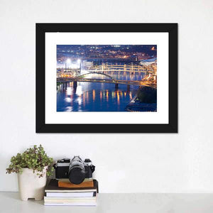 A nocturnal cityscape of the Allegheny River, showing illuminated bridges and city lights reflected on the water. The modern palette of blue, yellow, white, and black creates a vibrant, energetic mood that suits contemporary home or office decor.