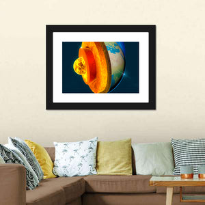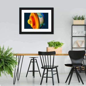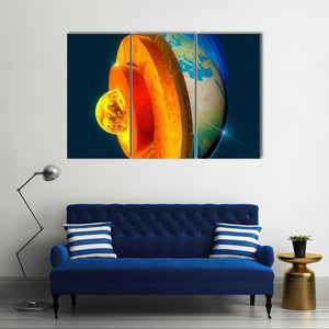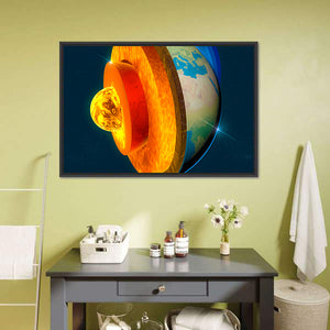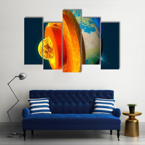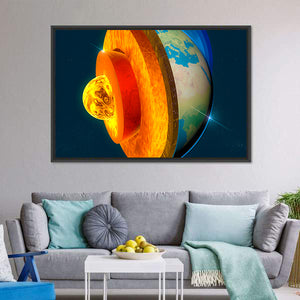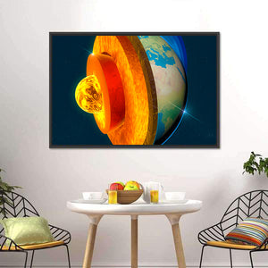 An illustrated depiction of Earth’s layers, this canvas shows a cutaway view of the core, mantle, and crust set against a cosmic, star-filled background. Rendered in layered, centered composition with orange, yellow, blue, and green tones, it carries an informative, scientific mood suited to modern rooms, home studies, or educational spaces.