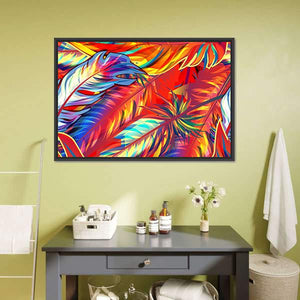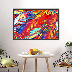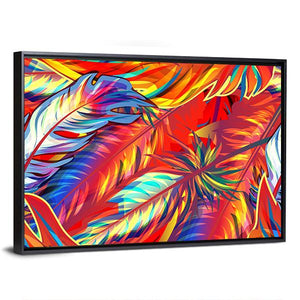 Exotic Feather Canvas Wall Art features abstract feathers and leaves in bold reds, blues, yellows, orange and white with metallic gold outlines and layered textures. Overlapping forms and dynamic lines create a vibrant, energetic graphic piece that fits modern home decor.