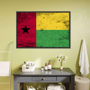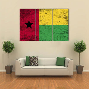 A canvas print of the Guinea-Bissau flag rendered in a vintage, abstract style that reads bold and patriotic. The symmetrical composition uses red, yellow, green and black with a distressed, scratched texture and the black star in the red field. It fits modern home or office walls as colorful flag decor.