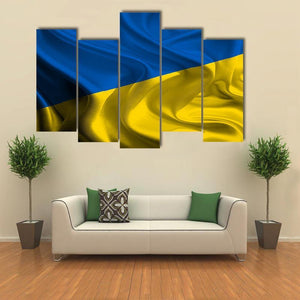 This canvas shows the Ukrainian flag split diagonally into blue and yellow, rendered in a modern, abstract style. A wavy texture suggests fabric and gives the piece a quiet, patriotic and symbolic presence that fits well in contemporary home decor.