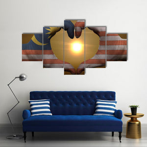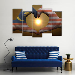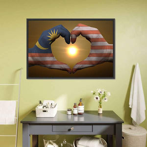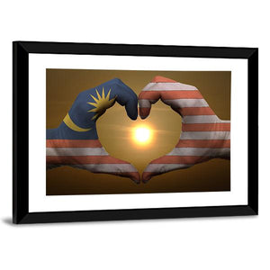 Hands form a heart, with one hand bearing the Malaysian flag and the other the American flag in a modern, graphic composition. The image feels symbolic, hopeful, and unifying, with blue, red, white, yellow and gold tones that suit contemporary home or living room decor.