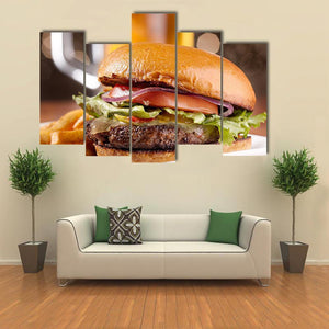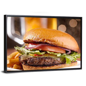 This photorealistic canvas shows a close-up, eye-level view of a cheeseburger with bun, patty, lettuce, tomato, onion, cheese and pickles, joined by fries and a beer mug. The warm brown, green, red and yellow palette creates an appetizing, casual vibe that works well in kitchens, dining rooms or casual restaurant spaces.