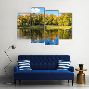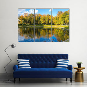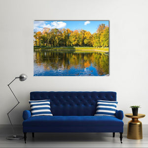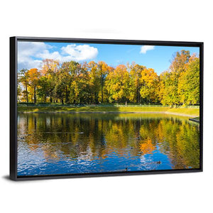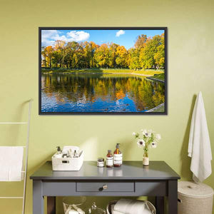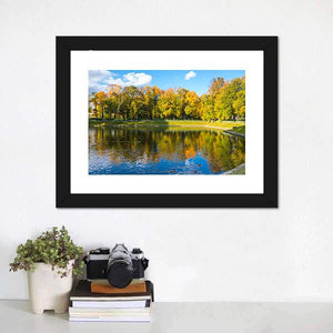 Summer Garden, Russia presents a peaceful lakeside scene of autumn trees, reflected water and ducks. Rendered photorealistically in blues, greens, oranges, yellows and whites, this print suits modern or nature-focused home decor like living rooms and bedrooms.
