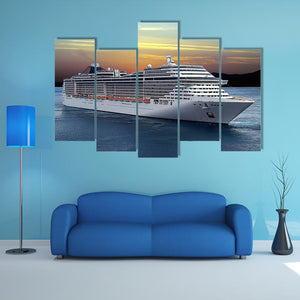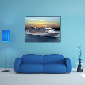 A realistic canvas print of a luxury cruise ship sailing into a glowing sunset over the ocean, with a serene, tranquil mood. The rule-of-thirds composition and pronounced depth highlight the ship’s detailed structure and glowing sky, making it a natural fit for modern homes and coastal-inspired rooms.