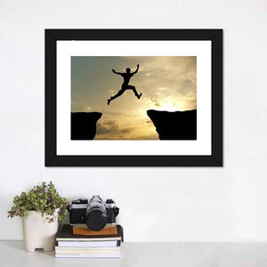 A silhouetted man jumps across a rocky gap beneath a dramatic sunset sky, framed by dark rock formations and generous negative space. Gold, blue, black, and white tones create a dramatic, adventurous, and aspirational atmosphere. Suited to modern living spaces and room decor that favor bold, minimalist imagery.