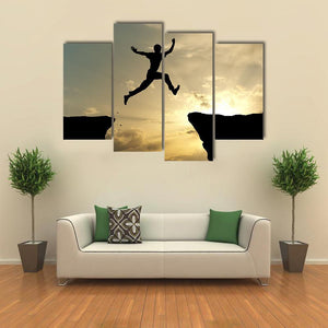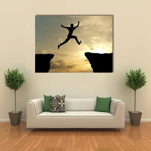 Sunset Silhouette Leaping Between Cliffs Canvas Wall Art