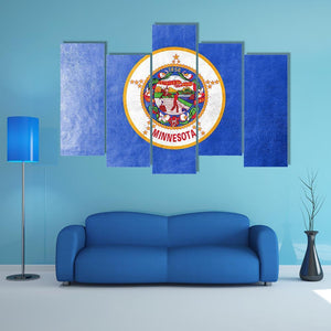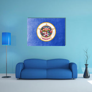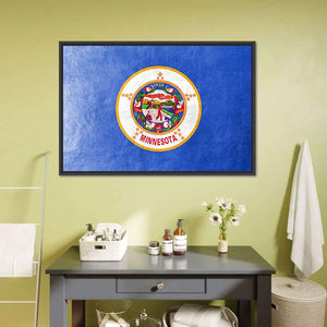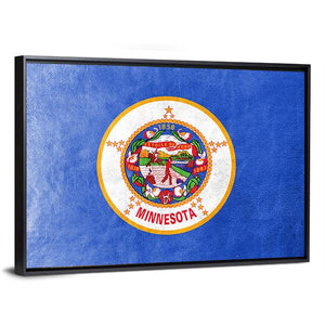 This canvas features the Minnesota state flag rendered with a balanced, symmetrical graphic composition. The blue, gold, green and red palette and visible state seal (including the year 1858) create a patriotic, official mood that suits house and modern room decor.