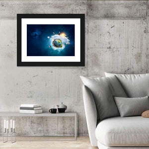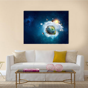 This canvas shows Earth, planets, stars, clouds and floating hot air balloons in a circular, depth-rich arrangement. The surreal digital scene uses blue, green, yellow and white to create a whimsical, imaginative cosmic mood with miniature cities on floating clouds. It fits modern homes and rooms that favor playful, astronomy-inspired wall decor.