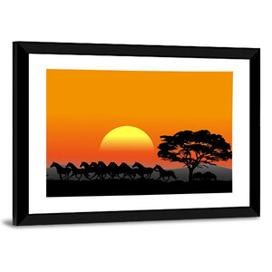 A running herd of silhouetted horses crosses a large, setting sun beside a lone tree, rendered in orange, yellow, black and hints of green. The minimalist, modern silhouette feels both dynamic and serene, a quiet wild scene that suits modern or minimalist living rooms and entryways.