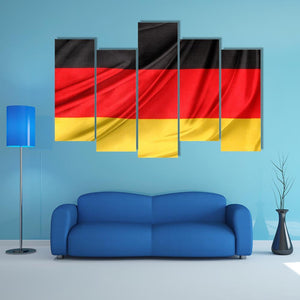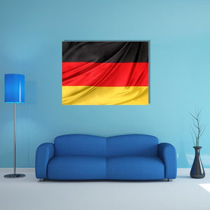 This canvas print shows the German flag with realistic fabric folds and texture, rendered in bold black, red, and yellow. Its symmetrical composition gives a proud, nationalistic presence that fits modern home decor and patriotic spaces.