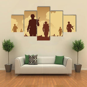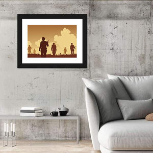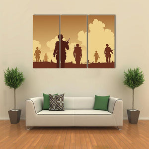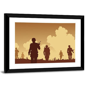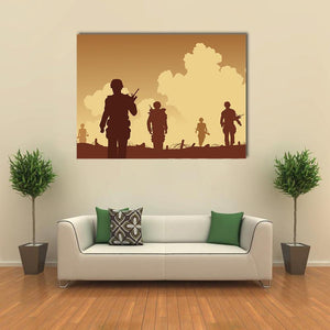 Soldiers Walking On Patrol shows silhouetted soldiers and barbed wire against a brown-and-tan sky with clouds. The rule-of-thirds composition and somber, dramatic tone make this canvas well suited to modern, minimalist rooms or military-themed decor.
