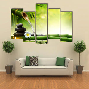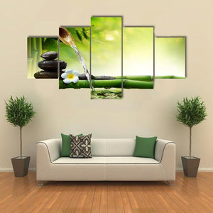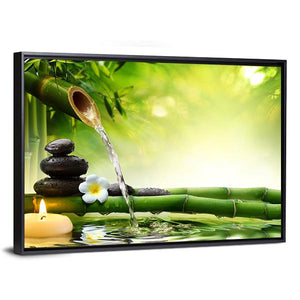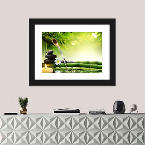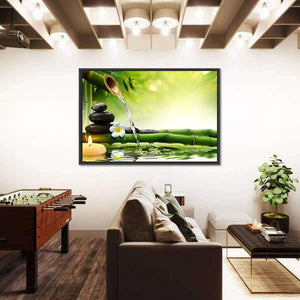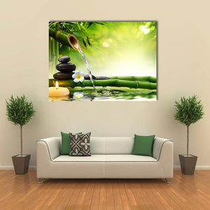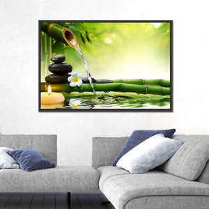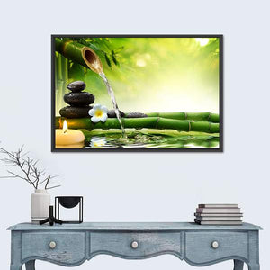 Spa Stones In Garden Canvas Art features bamboo with flowing water, stacked zen stones, a plumeria flower, and a lit candle. The balanced composition and green, white, and yellow palette create a tranquil, spa-like atmosphere. It works well with modern home decor and other calm, meditative spaces.