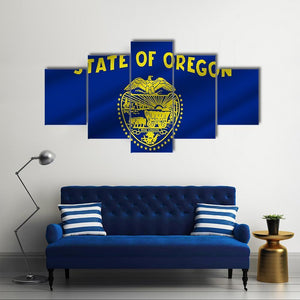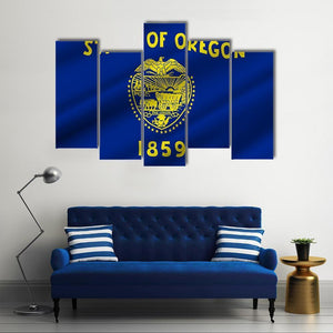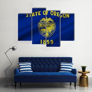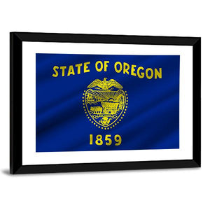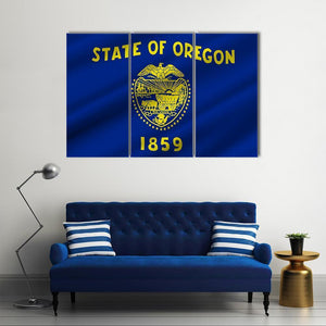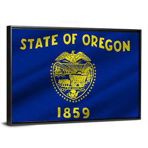 This canvas depicts the State of Oregon flag, featuring the state seal and the year 1859 in a centered blue-and-gold graphic. It has a formal, patriotic mood and works well in modern home and room decor.