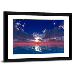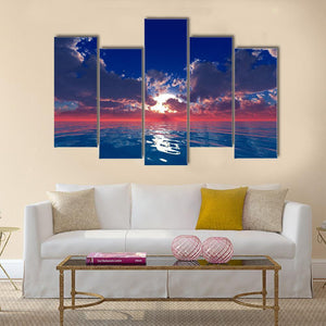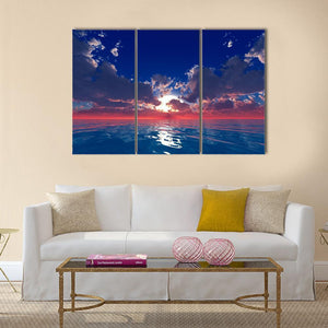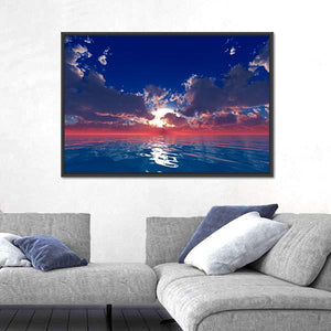 An ocean sunset canvas that shows the sun peeking through clouds and casting rays across calm water. Blues, reds, whites and yellows create a serene yet vibrant modern landscape with visible ripples on the water, composed using the rule of thirds and suited to modern room decor.