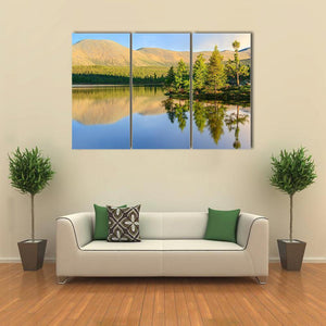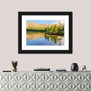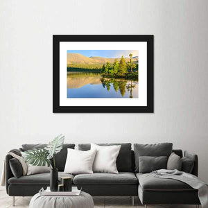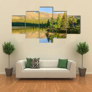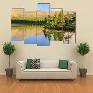 A realistic landscape canvas of a mountain lake in summer, with calm water offering a clear reflection of trees and mountains. Sunlight hits the treeline and gives the scene a serene, peaceful feeling that fits modern or nature-inspired rooms.