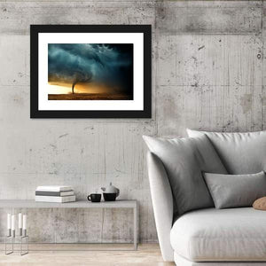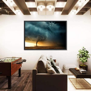 A tornado forms beneath ominous storm clouds over an open field, dust swirling at its base and a clear sense of motion. The composition reads powerful and dramatic, with deep blues, grays and touches of yellow and brown—an intense modern landscape that fits modern home or room decor.