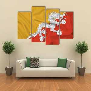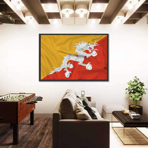 Featuring the Bhutan flag and its traditional dragon motif, this canvas print uses diagonal lines and a wrinkled texture to suggest motion. The graphic composition and a bold, vibrant palette of yellow, orange, red, white, and grey bring energetic color to modern home decor. It suits modern rooms and room decor that favor striking graphic wall art.