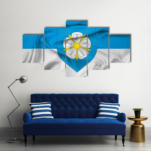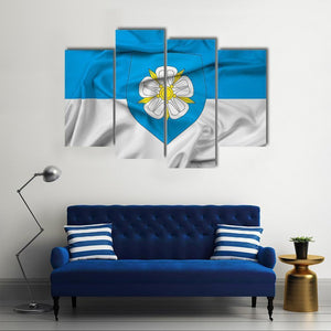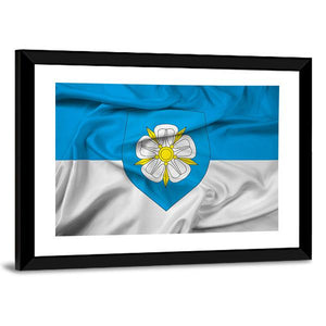Waving Flag Of Viljandi presents a modern, formal rendering of Viljandi’s flag with a stylized flower and a heraldic shield. The symmetrical composition and restrained blue, white, and yellow palette suits contemporary homes and room decor that favor clean, civic-inspired pieces.
