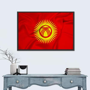 A centered depiction of the national flag of Kyrgyzstan, rendered in bold red with a bright yellow emblem for a patriotic, modern look. This graphic piece works well as home wall decor in rooms that favor strong, centered imagery.