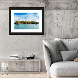 This canvas art captures a serene coastal scene in New Zealand, featuring a yacht in a tranquil bay under a bright blue sky. The inviting colors of blue, green, and white create a peaceful atmosphere suited for modern decor.