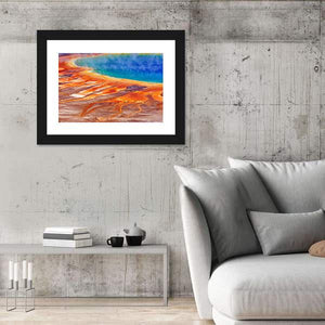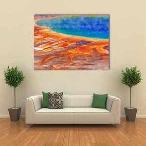 This vibrant artwork captures the breathtaking beauty of the Grand Prismatic Spring in Yellowstone National Park. With its rich palette of blue and orange hues, it showcases the colorful mineral terraces and steam rising from this geothermal wonder, creating a serene atmosphere that's perfect for any space.