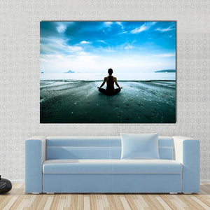 This canvas art features the silhouette of a young woman in a tranquil lotus position on the beach, framed by the calming ocean and an expansive sky. With serene blues and teals, it creates a peaceful atmosphere that's perfect for any room in your home.