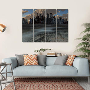 Capture the essence of an abandoned city with this dramatic canvas art featuring dark, imposing skyscrapers set against a vast ocean and cloud-filled sky. The muted palette of grays, blues, and browns creates a somber atmosphere, making it a versatile piece for modern and abstract decor.