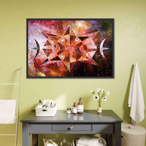 Cosmos Nebula Panoramic Canvas pairs geometric patterns with celestial bodies in a symmetrical, starburst composition inspired by a cosmic nebula. Rendered in red, orange, gold, purple, and black, it creates a mystical, vibrant mood that fits modern, geometric interiors.
