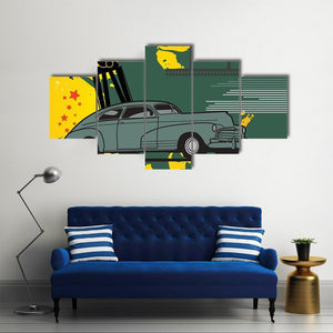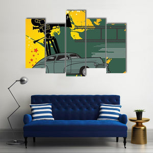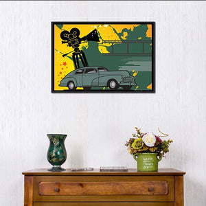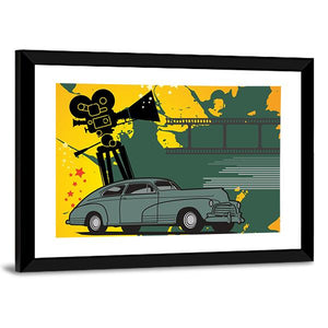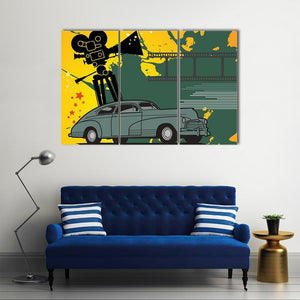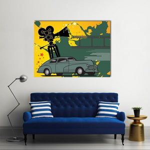 Abstract Of Cinema Canvas Wall Art centers a layered illustration of a vintage car, film reel and old movie camera, framed by map-like background elements and star accents. The green, yellow, black and white palette creates a nostalgic, cinematic retro mood that works well in a living room or media room with modern or vintage decor.