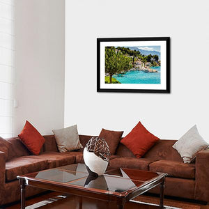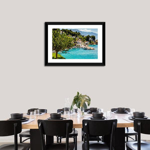 This canvas art captures a serene coastal town in Croatia, showcasing a charming harbor filled with boats surrounded by vibrant green hills and picturesque white buildings. The clear turquoise water reflects a sunny, idyllic atmosphere, making it a stunning addition to any wall.
