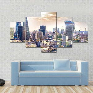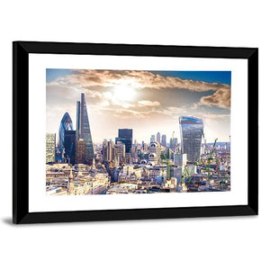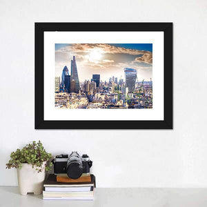 This canvas art captures a vibrant cityscape, showcasing London's iconic skyscrapers under a bright sky. The dynamic composition features sunlight filtering through clouds, creating an energetic atmosphere that's perfect for modern décor.