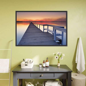 Bring the serene beauty of a sunset over the ocean into your space with this realistic artwork featuring a wooden dock. The calming palette of orange, yellow, and blue creates a peaceful atmosphere, making it a perfect addition to nature-inspired decor.