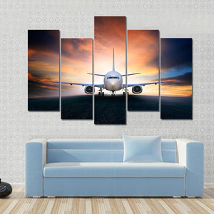 This beautiful canvas features an airplane on a runway under dramatic sunset clouds. The vibrant palette of orange, blue, and gray adds depth and serenity, making it an excellent choice for any modern décor.