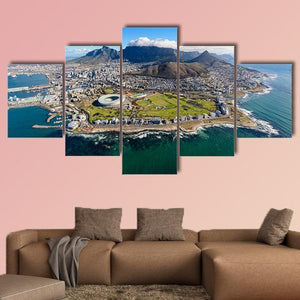 This photographic canvas shows an aerial view of Cape Town, with Table Mountain rising behind the harbor and a circular stadium near the coastline. The wide-angle, panoramic composition and a palette of blue, green, grey and white create a sprawling, bright coastal atmosphere that fits modern or travel-themed rooms.
