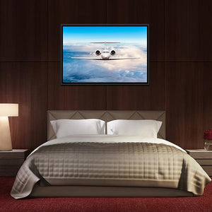 This canvas wall art features a private jet soaring through a bright blue sky, surrounded by fluffy white clouds. The serene and luxurious vibe invites a sense of travel and vastness, making it a captivating addition to any space.