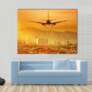 This captivating artwork features an airplane soaring above a bustling city skyline framed by majestic mountains. With its dramatic hues of orange and yellow, it evokes a sense of adventure and awe.