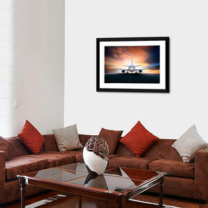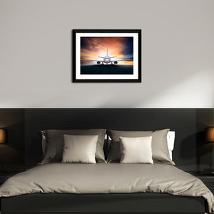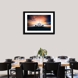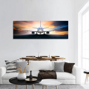This panoramic canvas shows an airplane on a runway at sunset, facing the viewer under dramatic clouds. The photorealistic image pairs wide-angle symmetry with orange, blue and gray tones for a powerful yet calm atmosphere. Suits modern living rooms, offices, or travel-themed spaces.