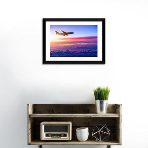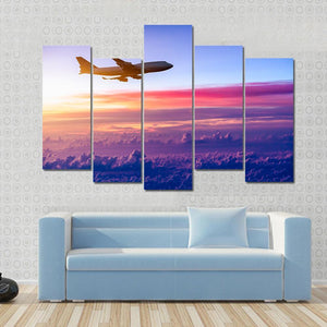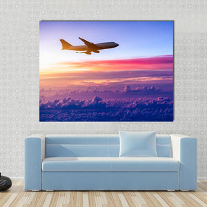 This canvas print features a serene silhouette of an airplane soaring through a vibrant sunset sky filled with clouds. The rich palette of blue, pink, orange, and purple creates a peaceful atmosphere, perfect for adding a touch of modern elegance to your space.