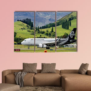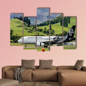 An Air New Zealand airplane sits at Queenstown Airport amid grassy hills, pine trees, and distant mountains. The photographic scene reads serene, majestic, and quietly adventurous under a cloudy sky. It suits living rooms and nature-inspired spaces.