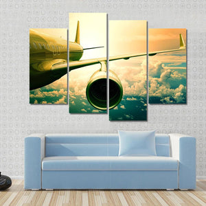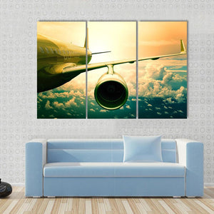 This canvas art features a close-up view of airplane wings soaring through a beautifully textured sky filled with clouds. The dramatic composition and epic palette of golden yellow, teal blue, and emerald green create an adventurous atmosphere, perfect for any modern decor.