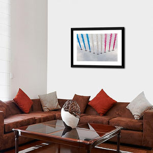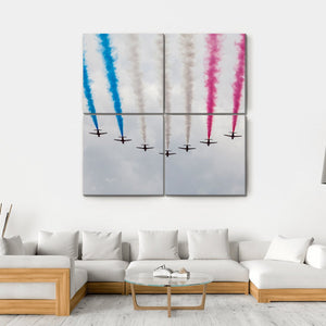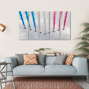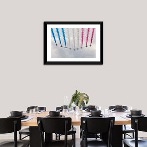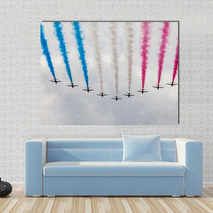 This vibrant canvas art captures nine airplanes in formation, leaving behind colorful smoke trails. Its dynamic and exciting mood makes it an eye-catching piece, perfect for any modern space.