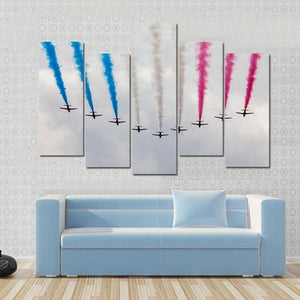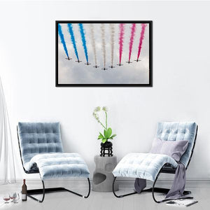 This art piece showcases dynamic airplanes flying in formation, leaving vibrant smoke trails against a blue sky. With its energetic and patriotic vibe, it's a striking addition to any wall, adding a sense of movement and excitement.
