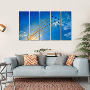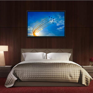 Celebrate the thrill of flight with our Airplanes On Airshow canvas wall art. This vibrant piece showcases six airplanes soaring in formation against a backdrop of blue skies and bright sunlight, leaving dynamic smoke trails. It's an energetic nod to aviation that’s sure to spark awe in any space.