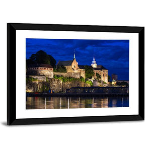 This canvas art captures the majestic Akershus Fortress against a dramatic waterfront backdrop. With its realistic detail and rich palette of blues and greys, it creates a historic ambiance, accentuated by illuminated windows reflecting in calm waters.