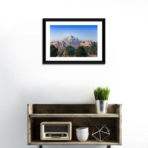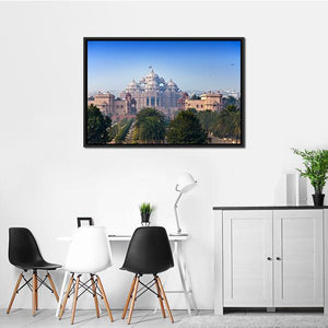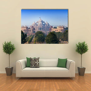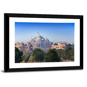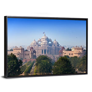 This canvas art captures the serene beauty of the Akshardham Temple, surrounded by manicured gardens and palm trees. The realistic depiction in soothing blues and greens evokes a peaceful atmosphere, making it a striking addition to your home decor.