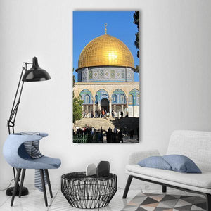 This photorealistic canvas captures Al Aqsa Mosque in Jerusalem, centering on the Dome of the Rock with its golden dome, blue-tiled facade, arches and steps. The low-angle composition and a palette of gold, blue, white and green create a majestic, serene, historical mood that suits modern or traditional living rooms, studies, or entryways.