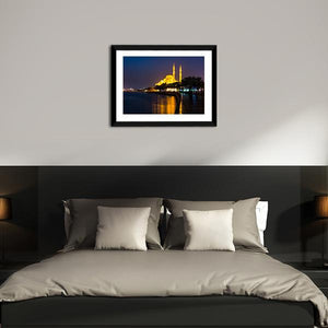 A photorealistic view of a mosque at night, with palm trees along a calm waterfront and golden illumination against a dark sky. The panoramic composition highlights blues, blacks, whites and warm golds to create an illuminated, modern cityscape mood. Suits modern living rooms, entryways, or office walls.